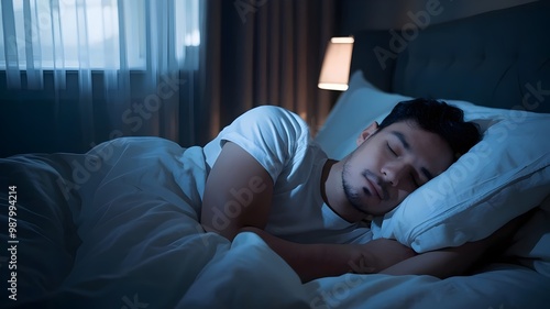 A photo of a man sleeping peacefully in a bed.