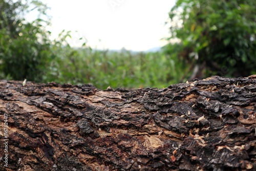 A photo of bark with a blurred background of green grass. Natural product photo spot