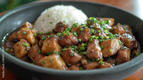 A photo of Filipino adobo, with tender chicken and pork in a soy-vinegar sauce, served with steamed rice, shot with a telephoto lens