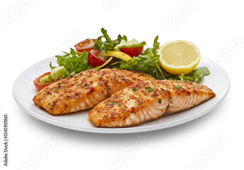 A photo of fried salmon fillets with lemon and salad on the side, white background
