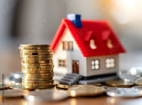 A photo of stacked coins alongside a peace sign and a house model on the table, representing concepts of interest or return.