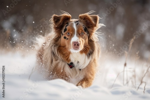 a photograph of an Australian shepherd against a snowy backdrop. Generative AI