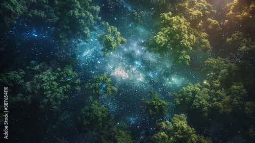 A photorealistic drone shot capturing a lush