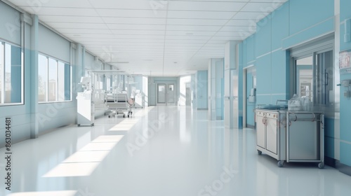 A photorealistic image of a blurred hospital corridor with a painting on the wall.