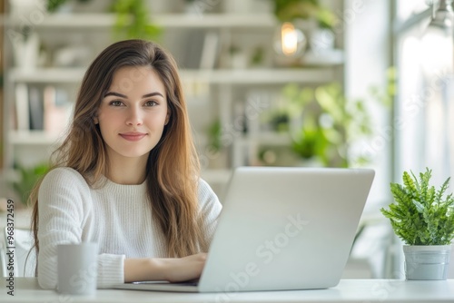 A photorealistic image of a young woman marketer, her laptop open in a bright, modern workspace, exuding a light, happy, and professional feel