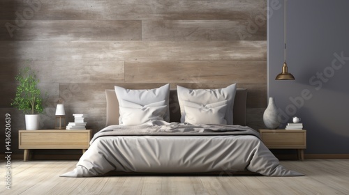 a photorealistic mockup of a serene bedroom in eco style, featuring a bed with organic linens, a wooden headboard made from recycled materials, and large potted plants