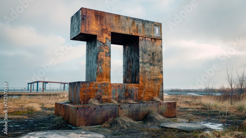 A photorealistic snapshot of a giant monument, constructed from rusted metal, located on an abandoned industrial site