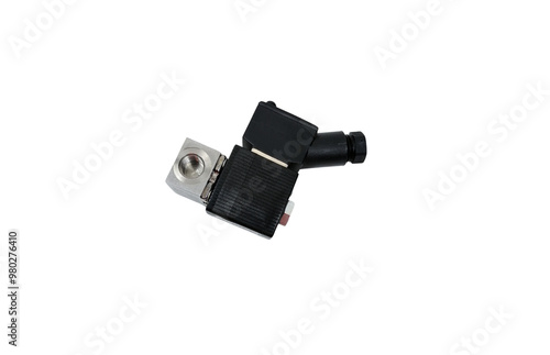 A photos of black and silver solenoid valve for mock up, png format, transparent background.
