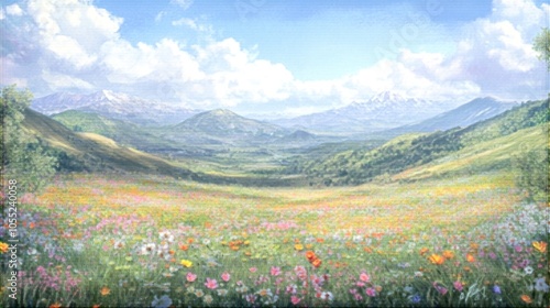 A picturesque scene of a spring meadow with wildflowers in full bloom,