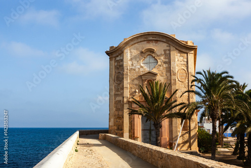 A picturesque view of Tabarca Island, Spain, Ancient church of San Pablo and San Pedro against the backdrop of the blue Mediterranean Sea. Palm trees and blue sky. Travel destination.