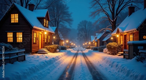 A picturesque village street adorned with glowing holiday lights and snow-covered rooftops, creating a festive atmosphere