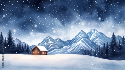 A picturesque winter night with a starry sky, a cozy cabin, and snow-laden pine trees, deep blues and whites in watercolor
