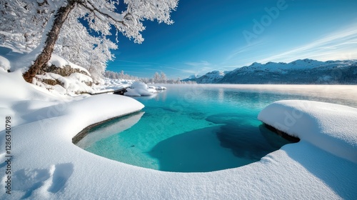 A picturesque winter scene showcasing a tranquil lake surrounded by snow-covered trees and mountains under a clear sky, exuding peace and natural beauty.