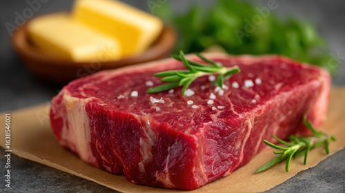 A piece of meat with a few sprigs of rosemary on top