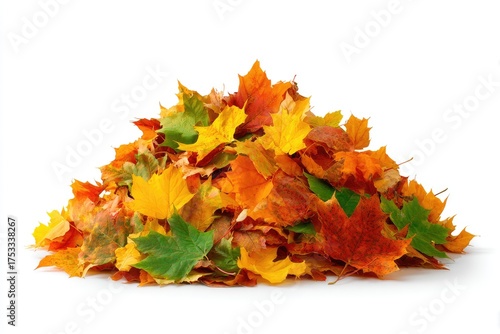 A pile of colorful fallen leaves of varying autumnal hues against a white background