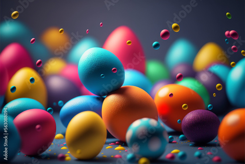 A pile of colorfully decorated eggs on a table with sprinkles on them and a black background with a black background with a black border and white border with a few smaller ones, Generative AI
