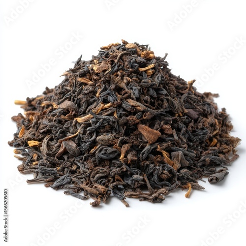 A pile of dried loose leaf black tea with brown and grey leaves and stems isolated on white background