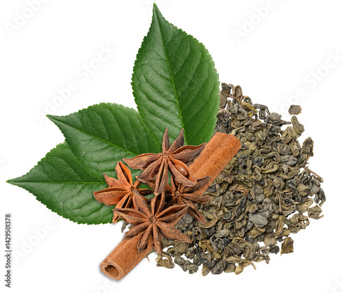 A pile of dry, rolled green tea leaves is arranged with three star anise, a cinnamon stick, and three green leaves, isolated background.