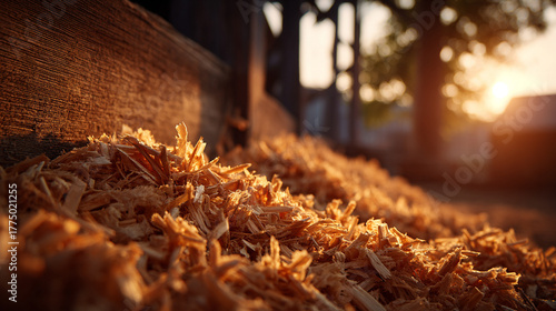 A pile of fine wood shavings bathed in warm light, evoking craftsmanship, natural texture, woodworking, and the organic beauty of raw materials.