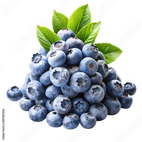 A pile of fresh blueberries with green leaves, isolated on transparent background