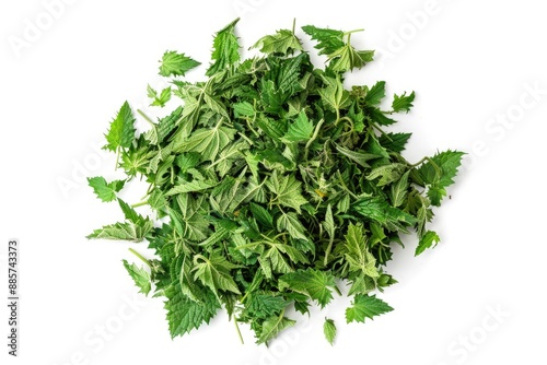 A pile of fresh green leaves sits atop a clean white surface