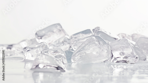 A pile of melting ice cubes on white background. Frozen crushed ice. Close up of clear cocktail ice cube.