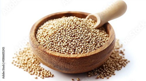 A pile of quinoa seeds in wooden bowl on white background