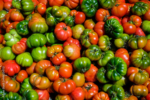 A pile of red and green heirloom tomatoes in a market in Martina Franca in the Puglia region of Italy.