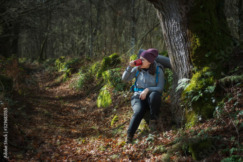 A pilgrim rests sitting drinking from her cup before continuing on the Way of Saint James