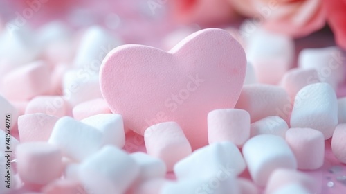 A pink heart surrounded by marshmallows and roses, perfect for Valentine's Day designs