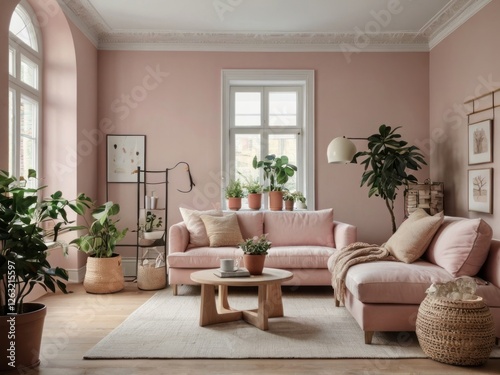 A Pink Living Room With Plants And A Sectional Sofa