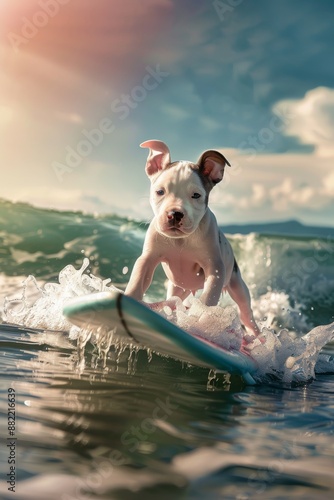 A pitbull pup on a surfboard in the sea