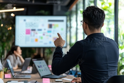 A pitch presentation with the creative team showcasing innovative concepts on a large screen