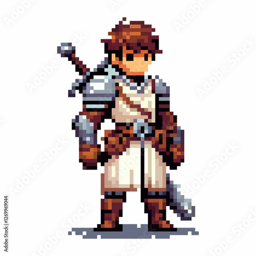 A pixel art warrior stands confidently, wearing medieval armor and holding a sword. The character is designed in vibrant colors, suggesting bravery and readiness for battle in a fantasy realm