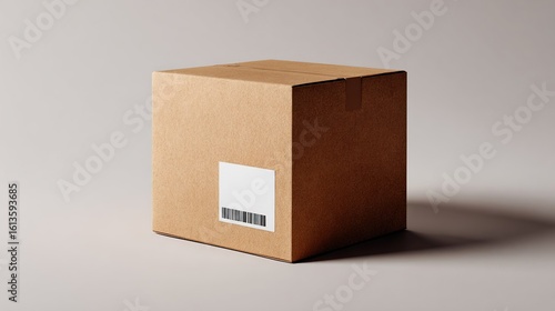 A plain brown cardboard box with a white label and barcode on a neutral background. Ideal for shipping or storage concepts.