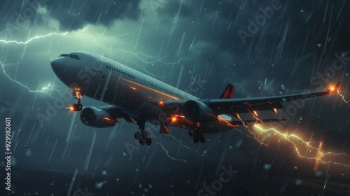 A plane flying through a fierce storm with lightning, showcasing the power and drama of nature against modern aviation.