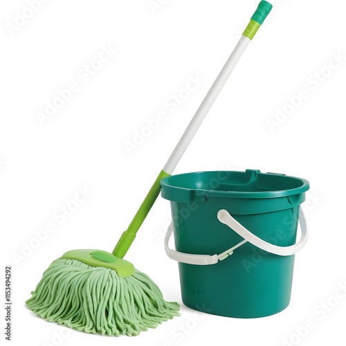 A plastic bucket with a green mop handle and a white mop head