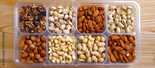 A plastic container filled with various nuts and peanuts rests on a wooden surface. The assortment includes almonds, cashews, walnuts, pistachios, and more.