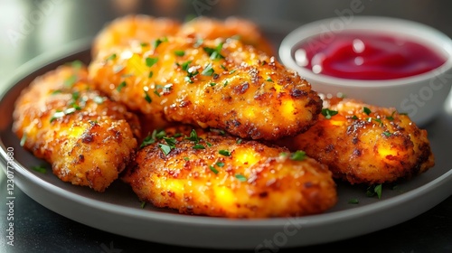 A plate of fried chicken with a side of ketchup