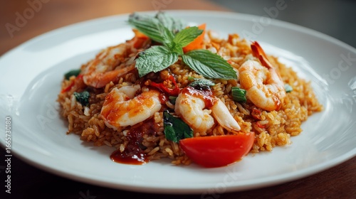 A plate of fried rice with shrimp garnished with basil and red chili peppers