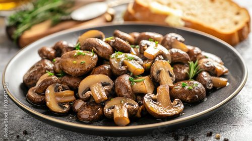 A plate of pickled honey mushrooms served alongside rye bread and butter, ready for a traditional appetizer. --chaos