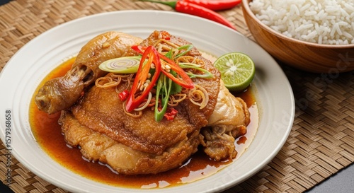 A plate of savory, braised chicken served with rice and garnishes.