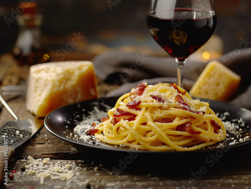 A plate of Spaghetti Carbonara with perfectly cooked pasta coated in a creamy egg and Parmesan sauce, topped with crispy pancetta and freshly ground black pepper. The setup includes a block of Parmesa