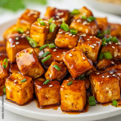 A plate of tofu with sauce and green onions. The tofu is cut into small cubes and is covered in sauce. The dish looks delicious and appetizing