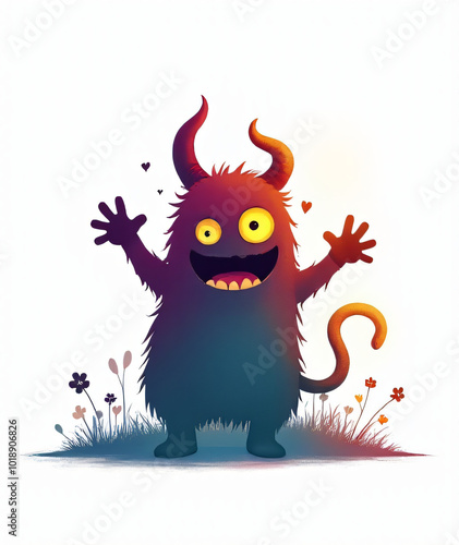 A playful and spooky greeting card scene featuring a cute cartoon monster with a colorful silhouette against a white background._00001_