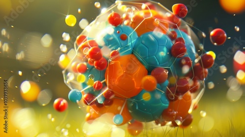 A playful depiction of the atoms in a soccer ball with electrons zooming between the protons and neutrons in its core.