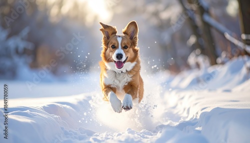 A playful dog running happily through the fresh snow. The dog's ears are perked up, and its tongue is sticking out, showing pure joy. It's a perfect winter day!