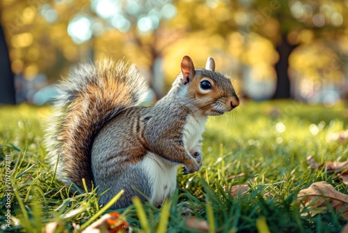 A playful grey squirrel stands tall among the lush green grass, its bushy tail waving in the warm breeze of the park, showcasing the beauty and liveliness of this charming mammal