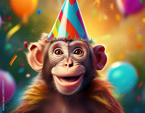 A playful monkey, wearing a bright and colorful party hat, looks excited and ready to celebrate in the background of vibrant colorful background