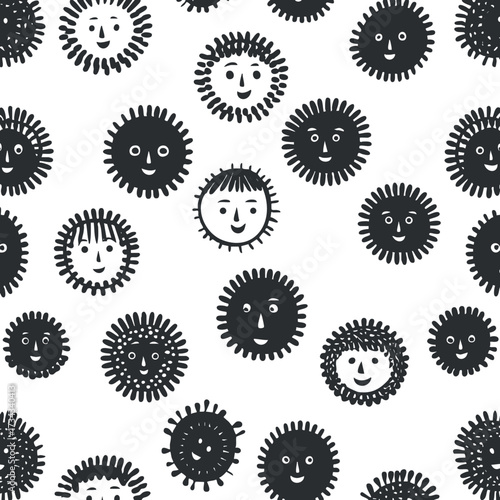 A playful pattern featuring smiling faces and abstract shapes in black and white..